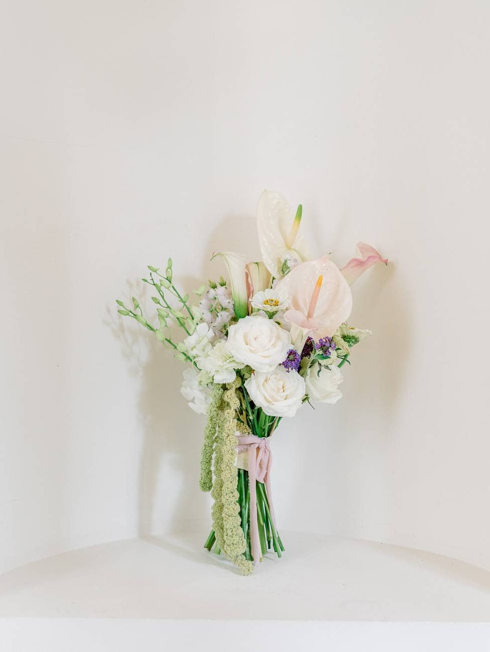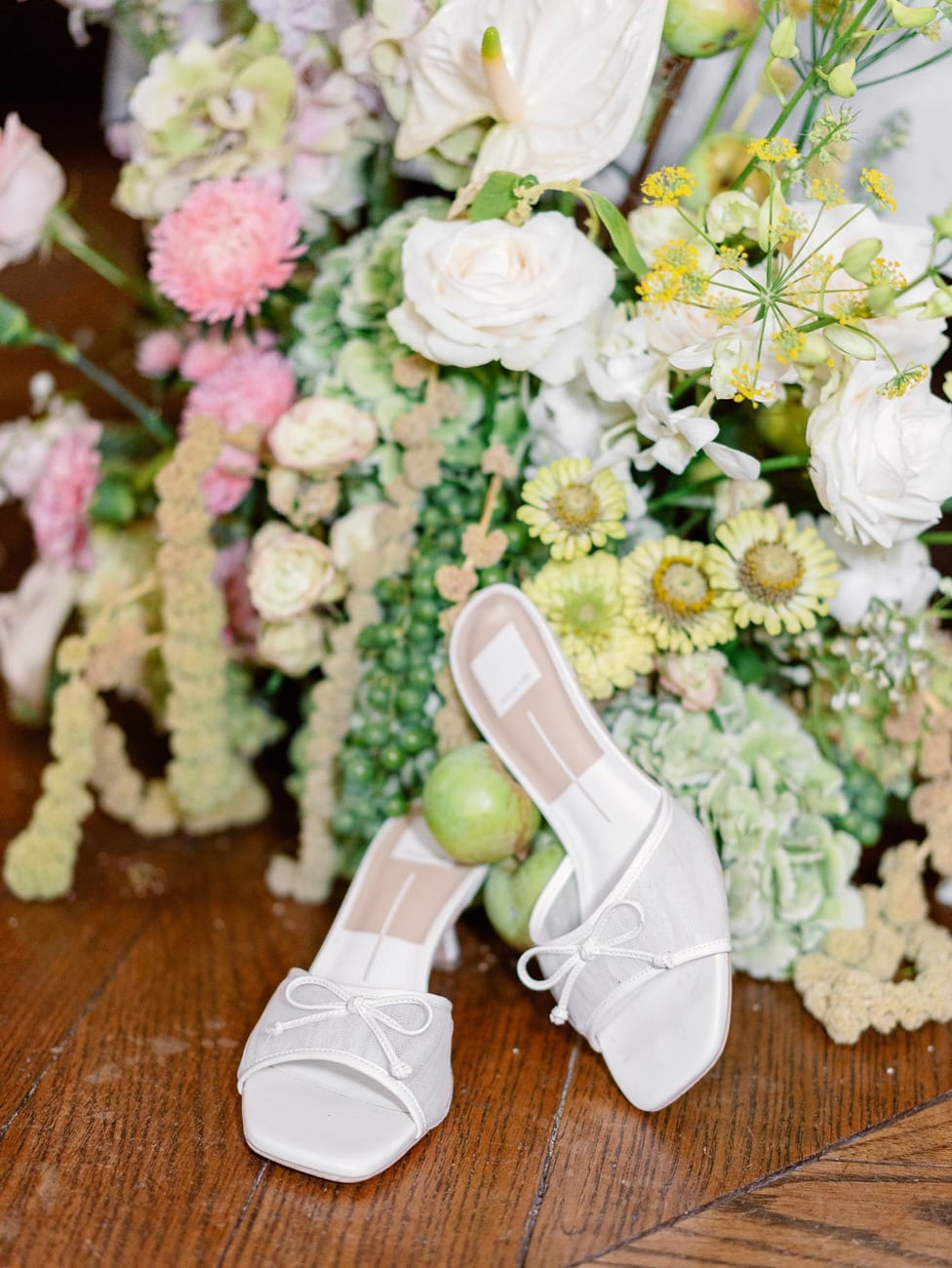 The dining table design reflected Lydia and Mitch’s vision of a modern yet timeless celebration. Vintage plates and soft pink glassware were paired with sleek black chairs and minimalist vases holding delicate blush arum flowers. Green apples were scattered across the table, adding a fresh and unexpected detail. At the base of the table, larger floral installations created a lush, garden-like feel.