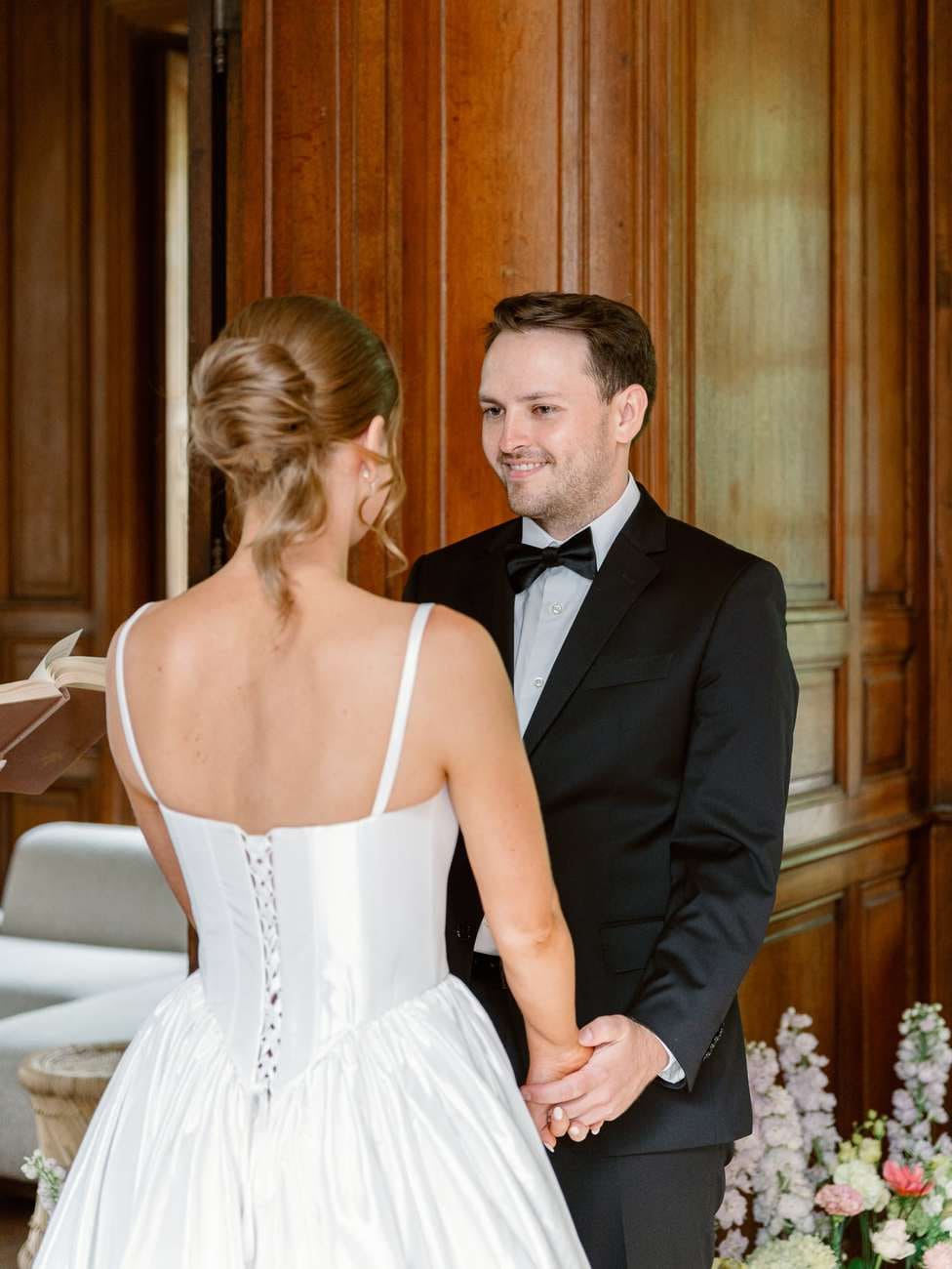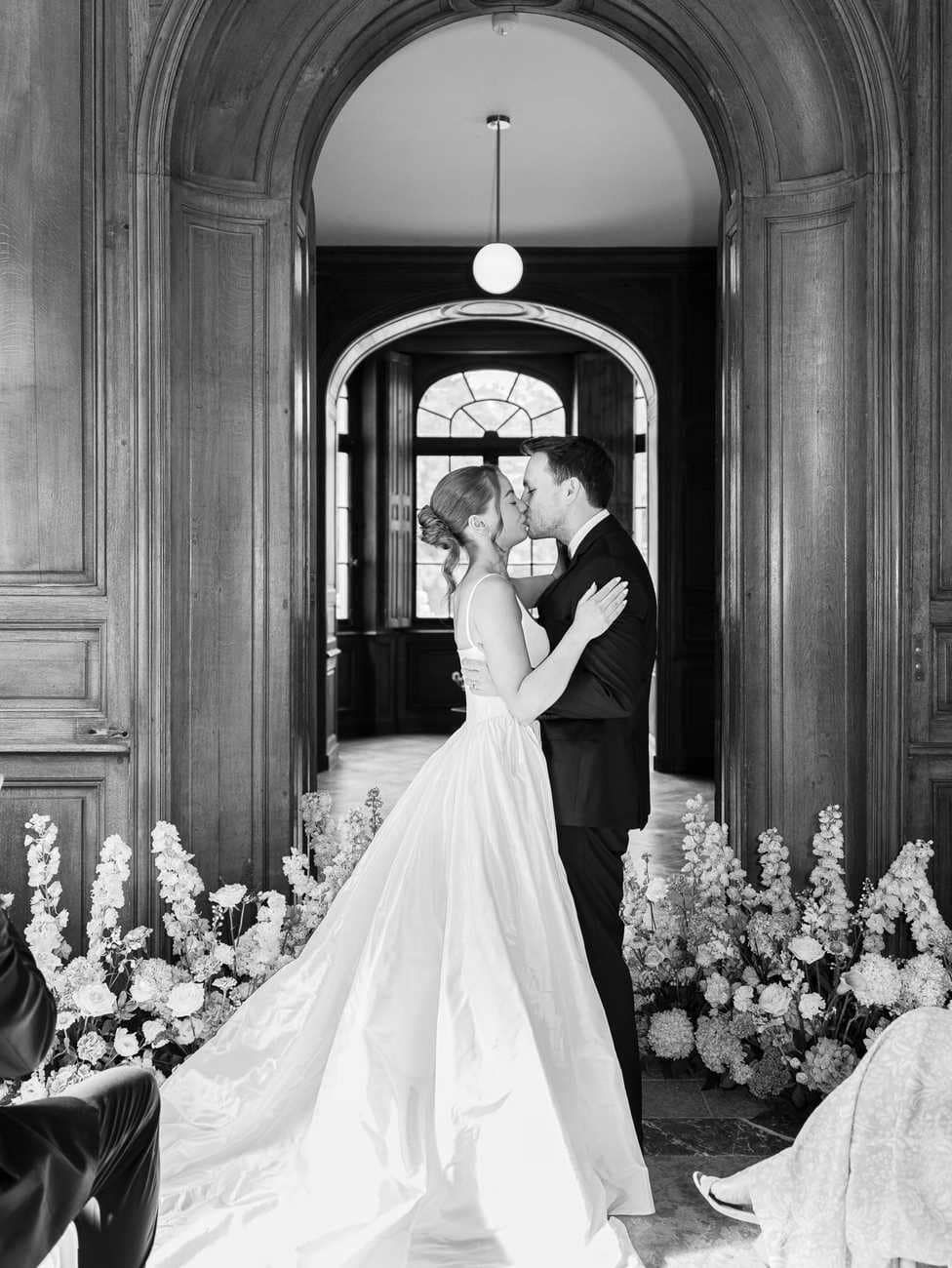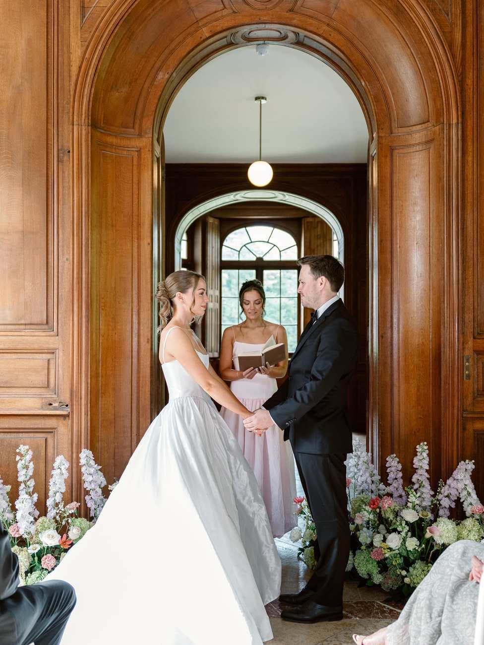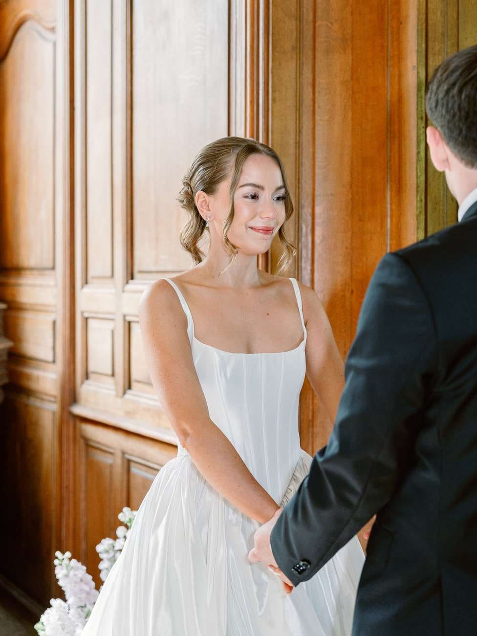 Lydia and Mitch chose to exchange their vows inside one of the elegant, wood-paneled rooms of Château de Thauvenay. The natural architecture of the space, with its arched doorways connecting the adjoining salons, created a romantic frame for the ceremony.