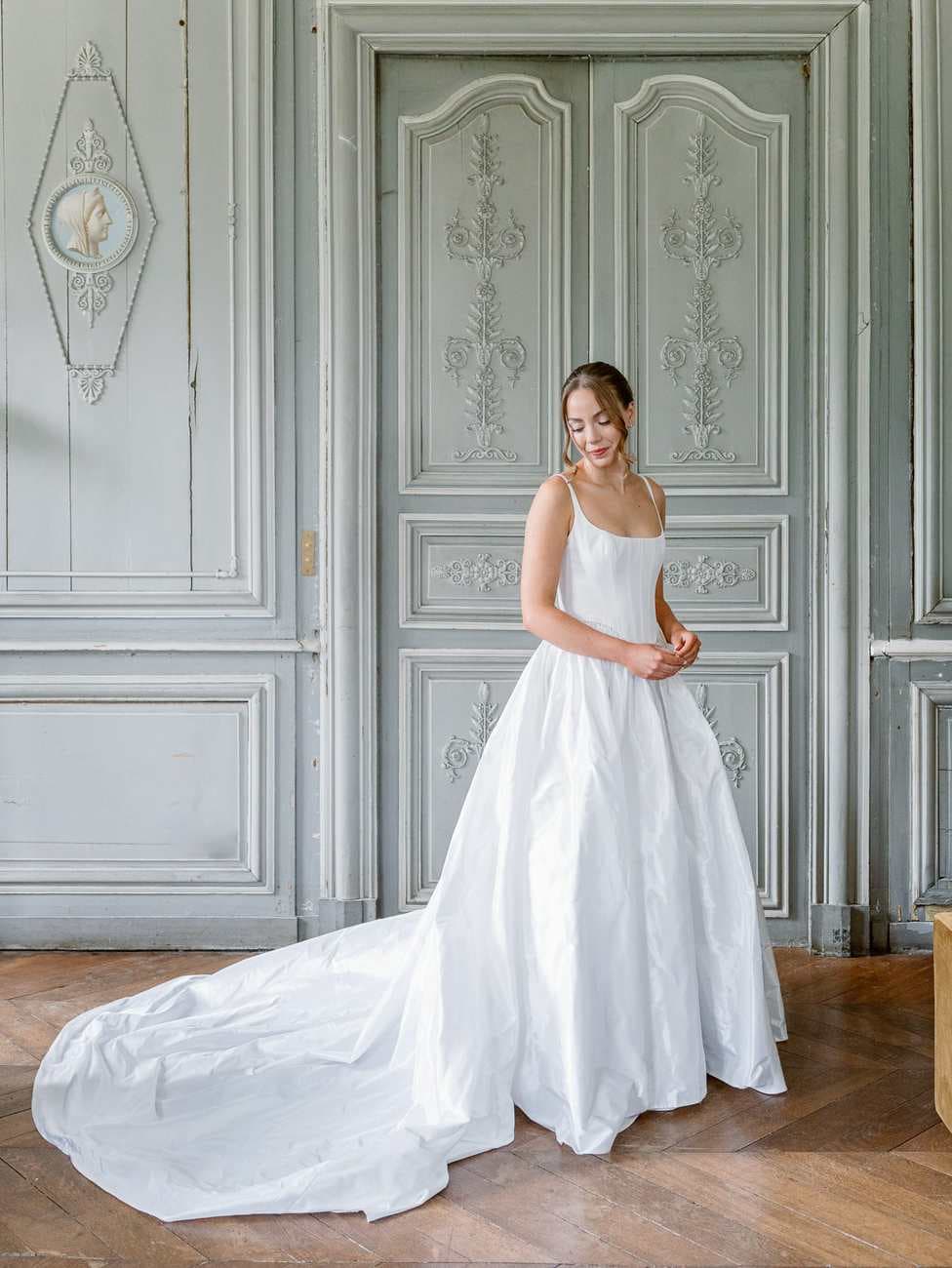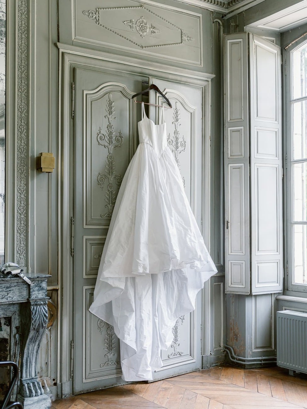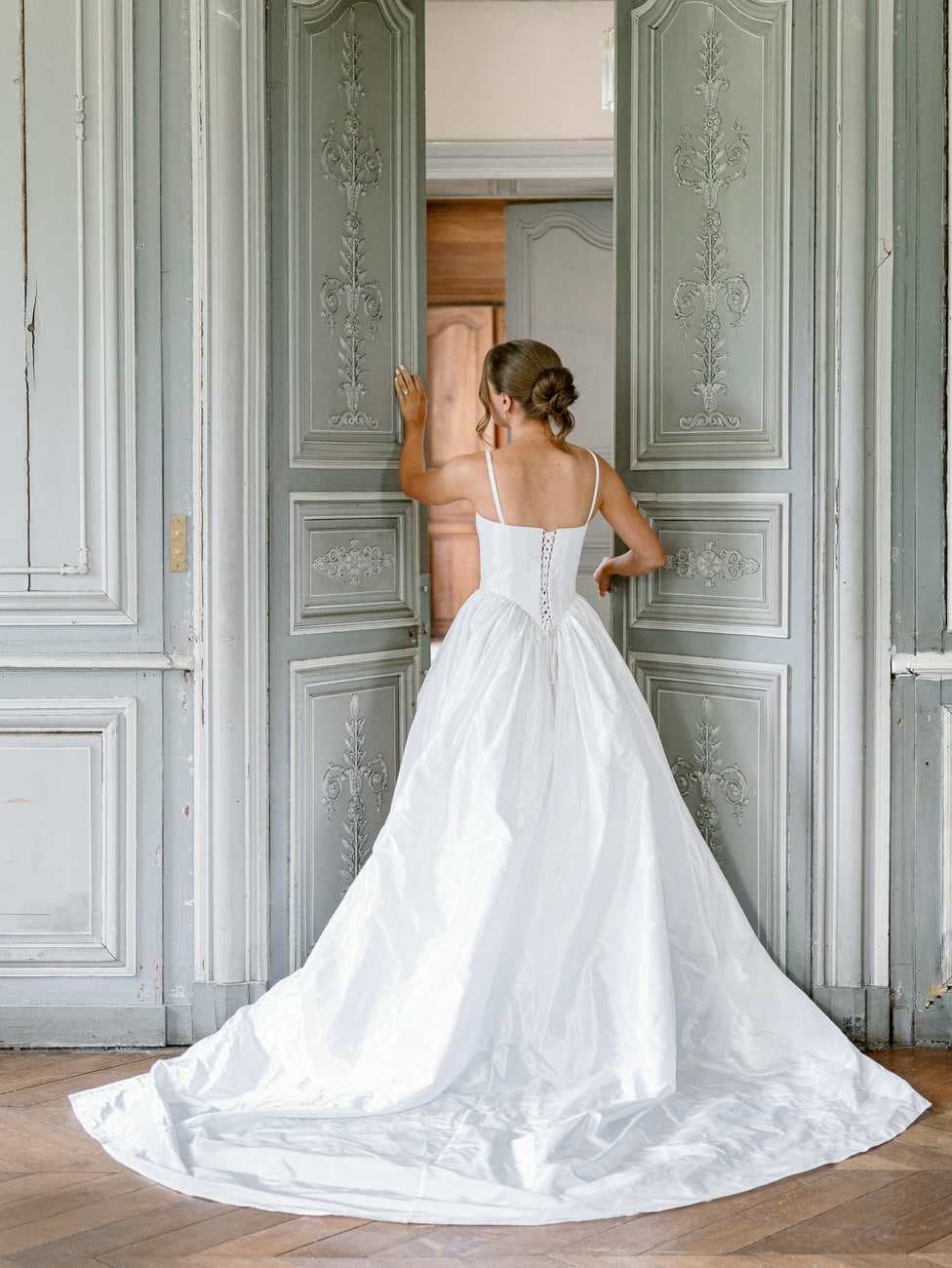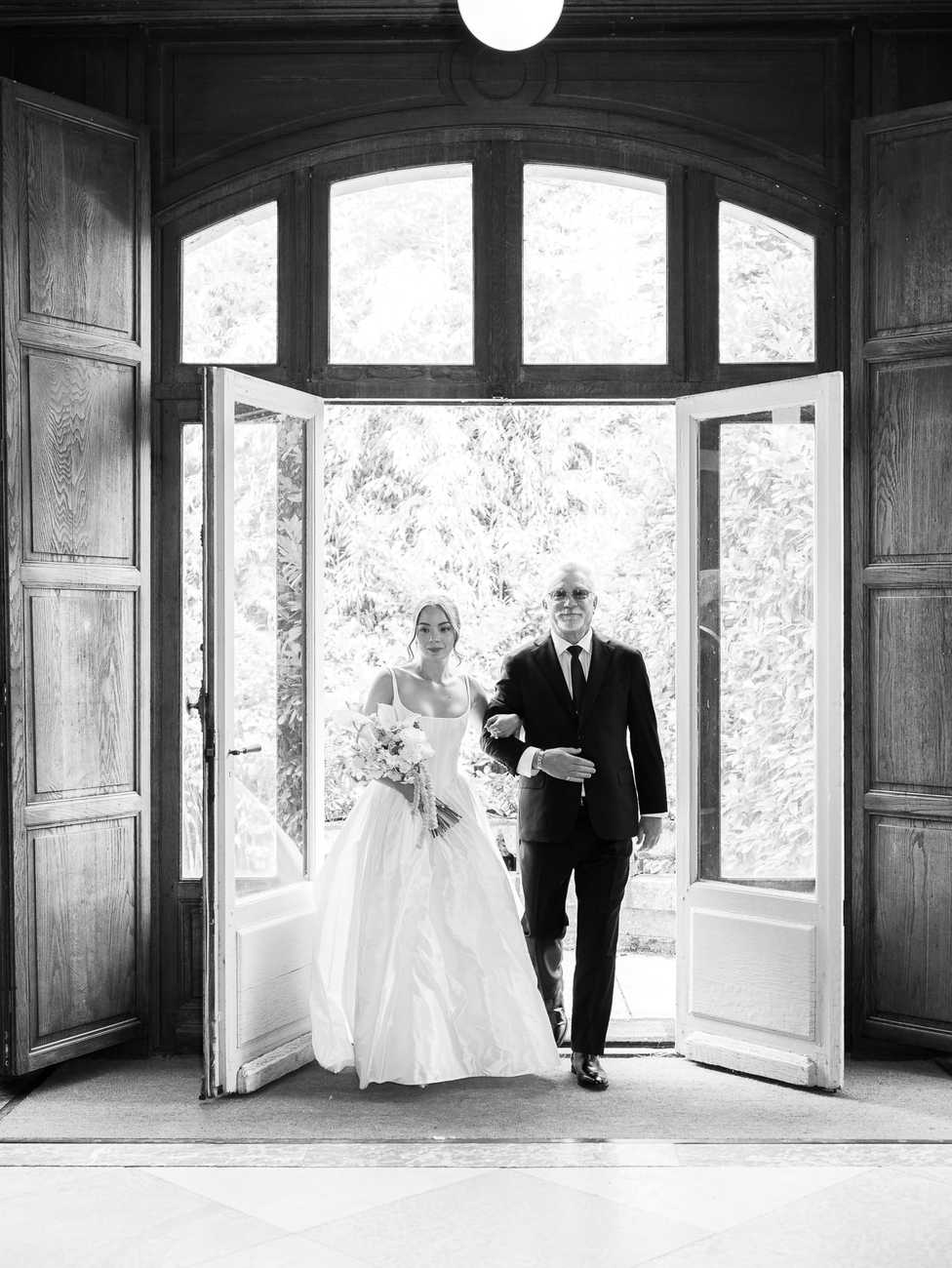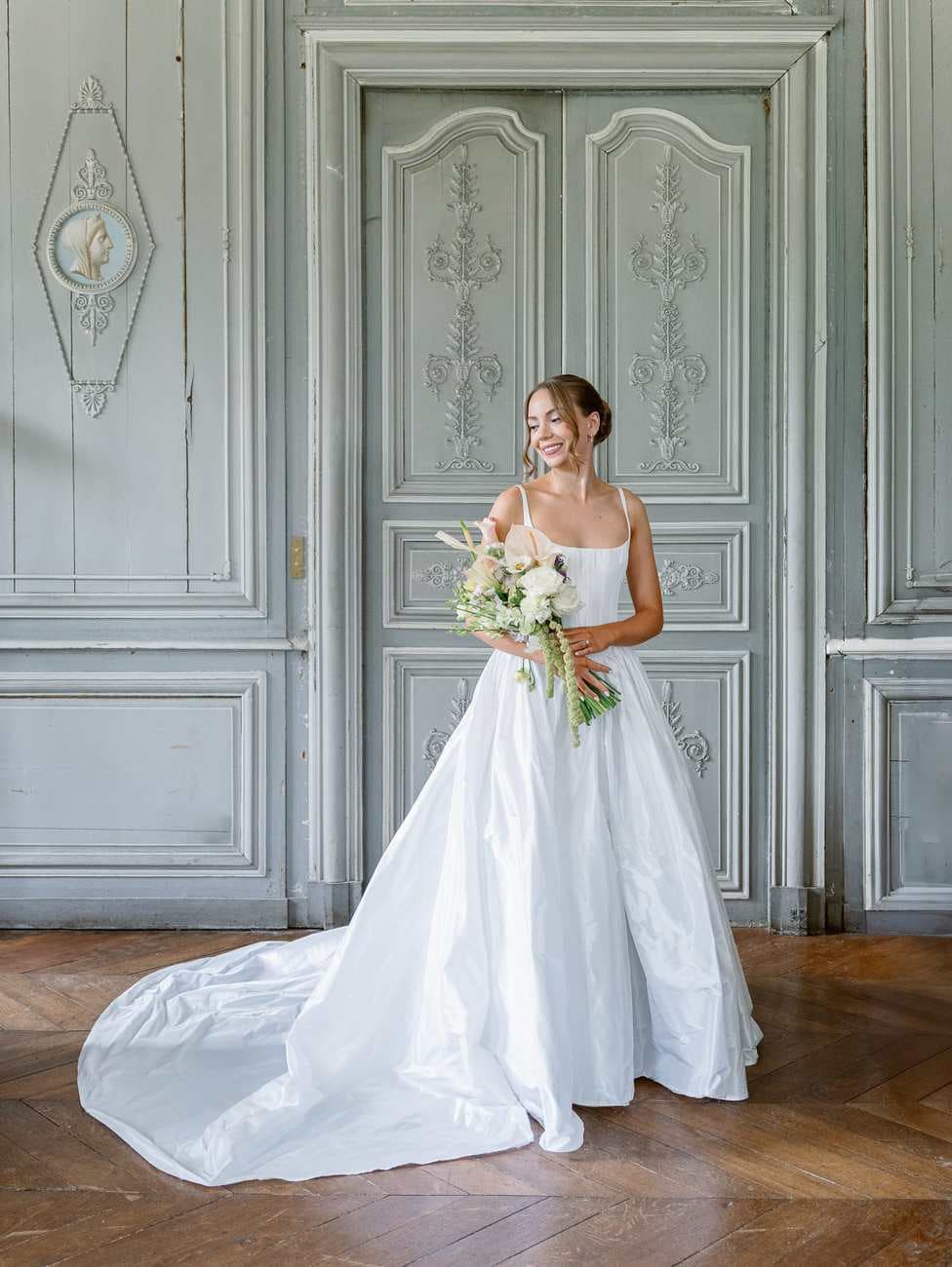 Lydia and Mitch chose to exchange their vows inside one of the elegant, wood-paneled rooms of Château de Thauvenay. The natural architecture of the space, with its arched doorways connecting the adjoining salons, created a romantic frame for the ceremony.