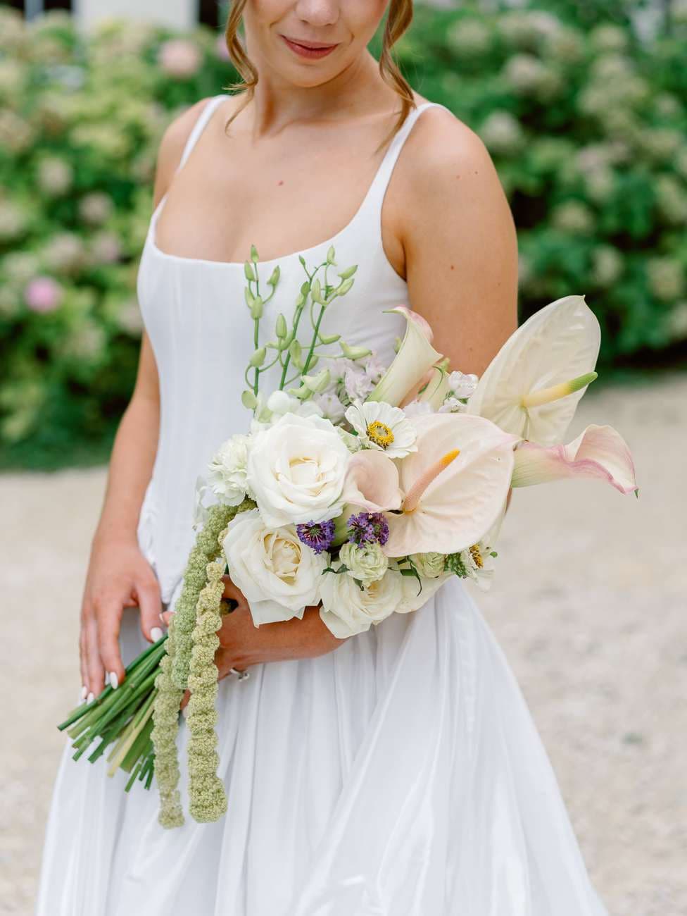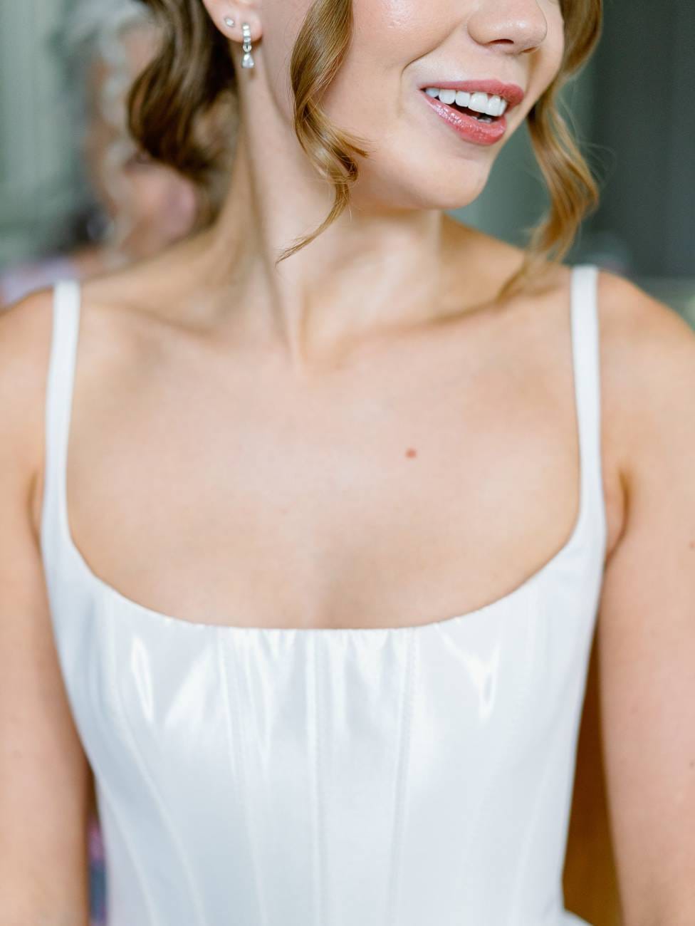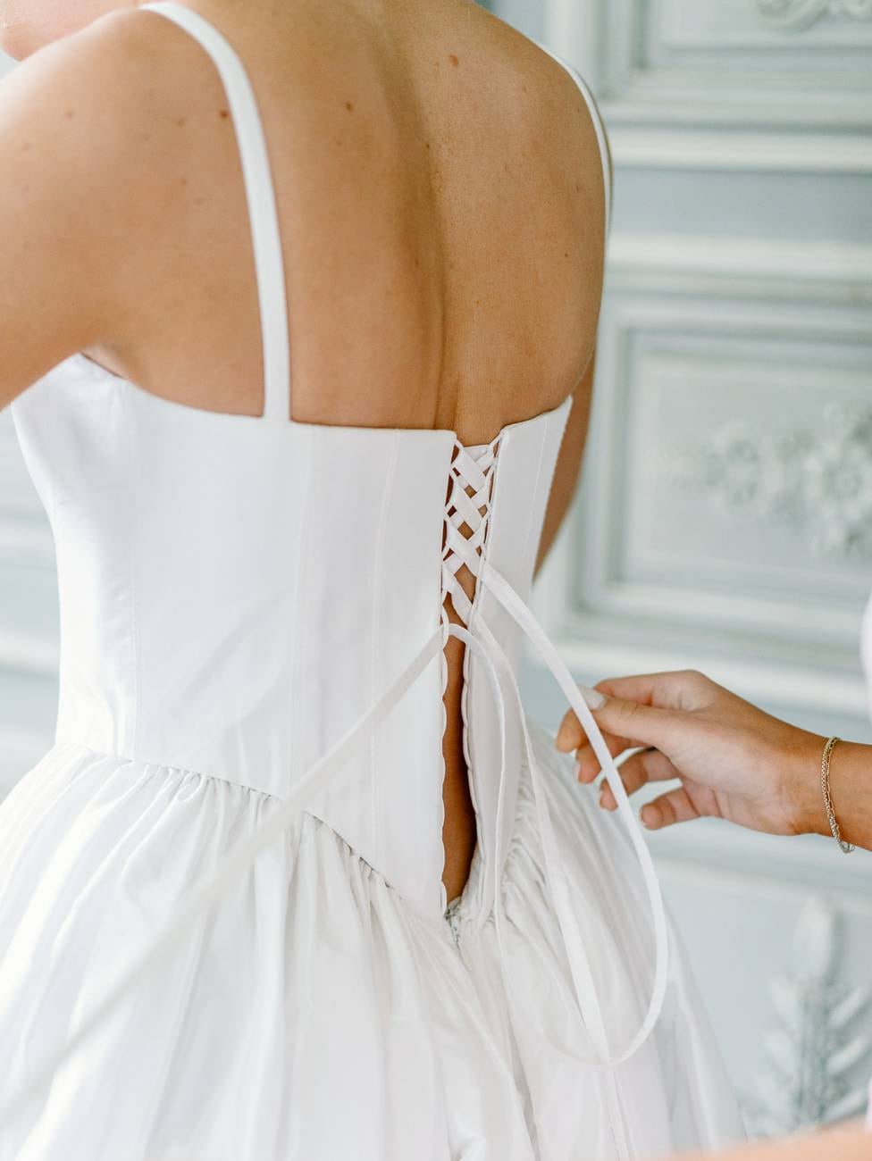 The preparations were wonderfully relaxed and personal. Mitch got ready on his own, taking a quiet moment to reflect before the day ahead. Meanwhile, Lydia was surrounded by her mother and sister, who lovingly helped her into her dress. She wore a stunning Alena Leena gown, featuring a romantic corset-style bodice with delicate straps and lace-up ribbons at the back. The skirt flowed gracefully with a soft, chiffon-like texture, creating an effortlessly elegant silhouette.