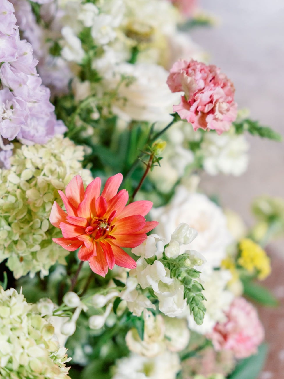 The floral design was intentionally kept soft and organic. Lush arrangements were placed directly on the floor, curving in a semi-circle around the ceremony space. The palette blended different textures and shades — rich greenery, pale green accents, touches of deep red and mauve, soft blush, white, and subtle hints of yellow — creating a look that felt natural yet refined.