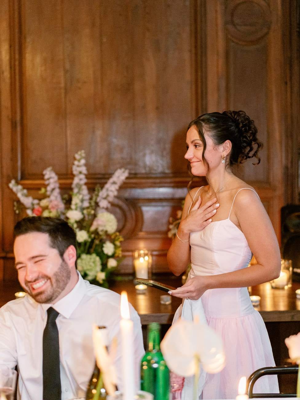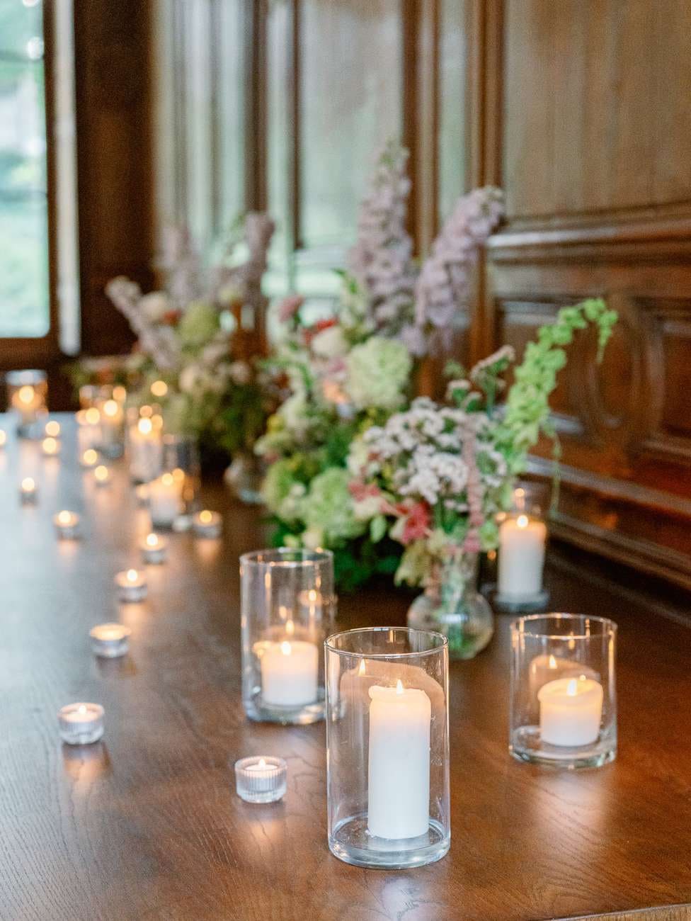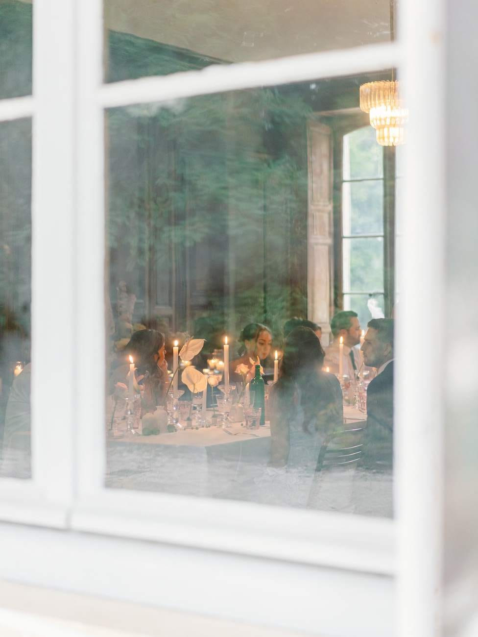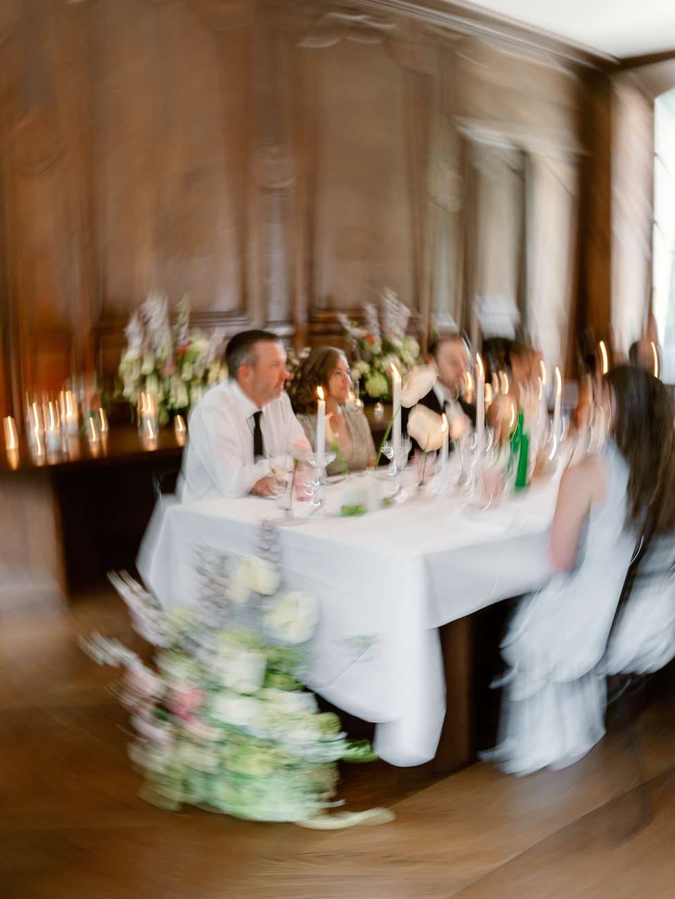 The evening continued inside one of the château’s beautiful wood-paneled rooms, creating a warm and inviting atmosphere for the wedding dinner. The space was carefully decorated with floral arrangements and glowing candles, with a particularly stunning display on the fireplace that added a romantic touch.