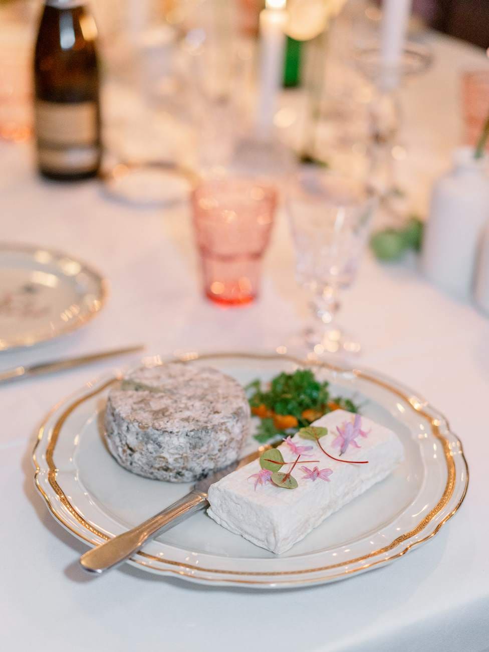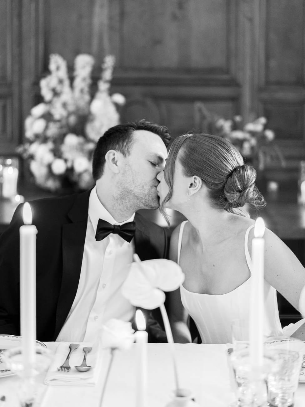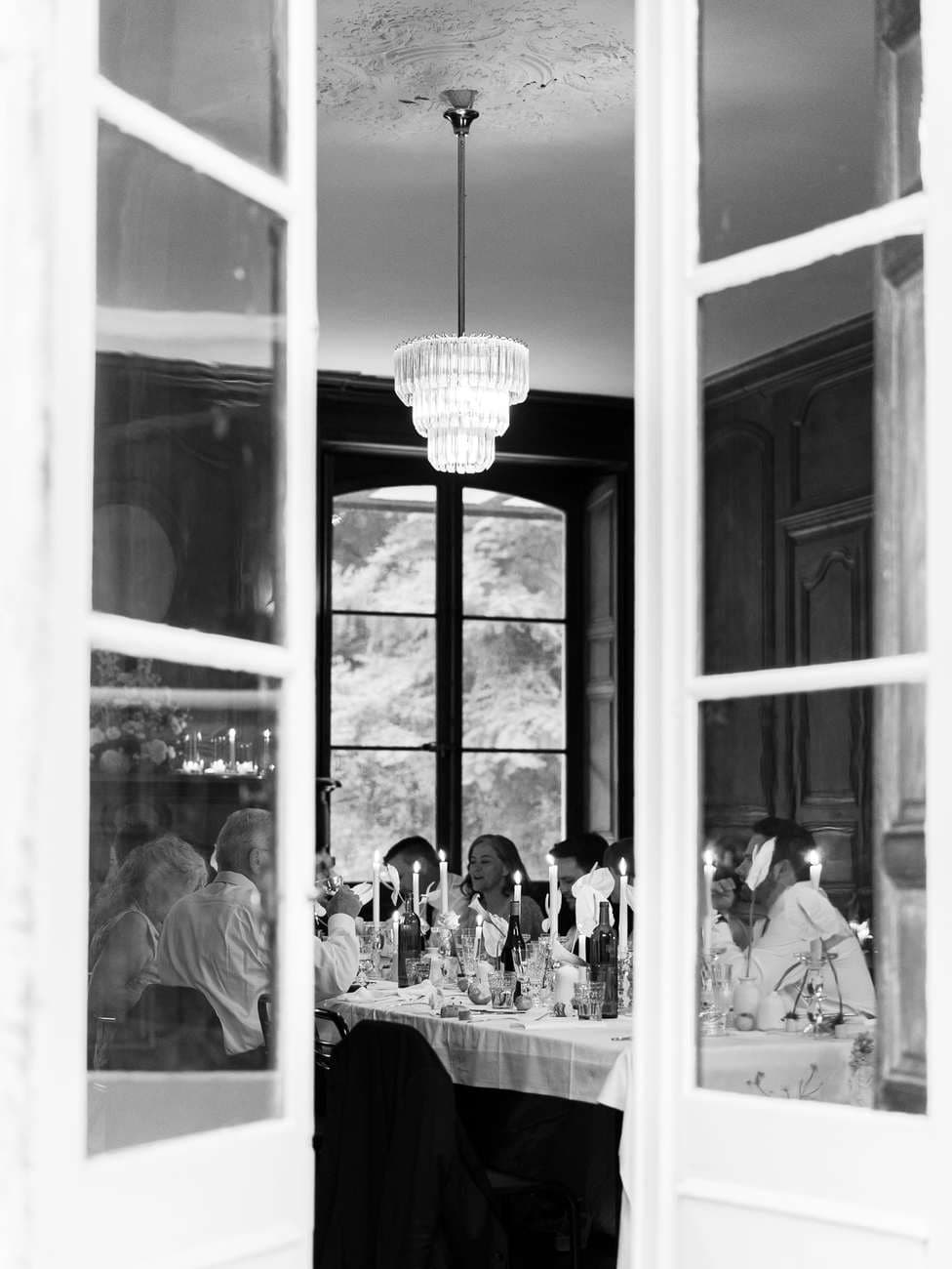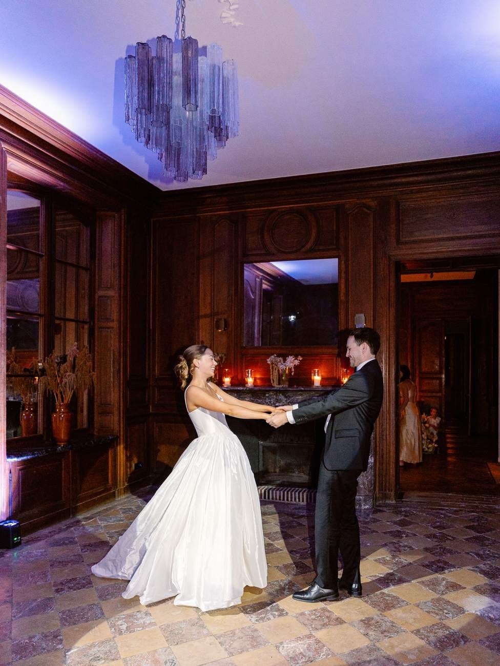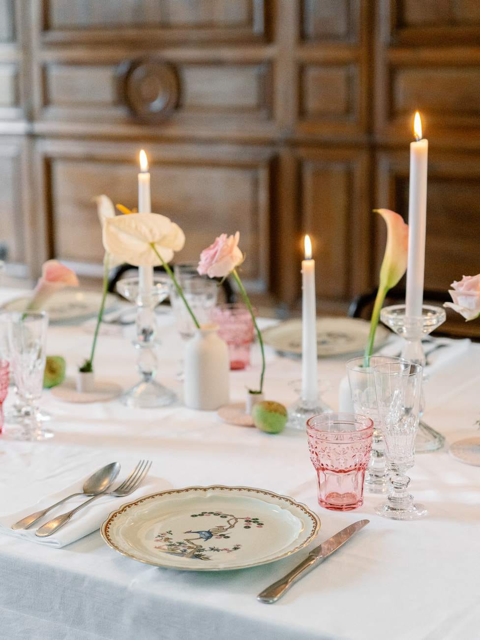 The evening continued inside one of the château’s beautiful wood-paneled rooms, creating a warm and inviting atmosphere for the wedding dinner. The space was carefully decorated with floral arrangements and glowing candles, with a particularly stunning display on the fireplace that added a romantic touch.